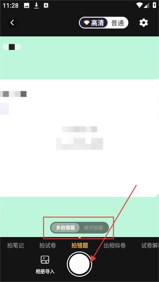 4、进入拍错题界面后,能够选择“多拍错题”等模式,接着点击拍摄按钮,通过拍摄的方式来收集错题。