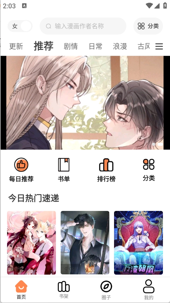 首页页面整合了丰富多样的漫画资源,涵盖日漫、古风、韩漫等不同类型。