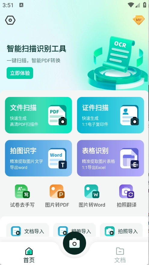 首页整合了丰富的扫描识别功能,涵盖文件扫描、证件扫描以及拍图识字等多种类型。