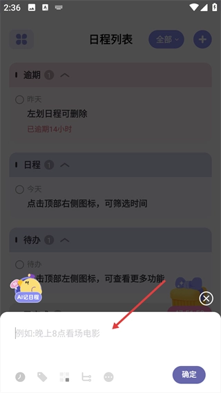 2、弹出内容输入框,在输入框中填写日程内容。