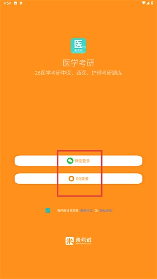2、在登录页面选择【微信登录】或【QQ登录】,使用对应的社交账号完成登录,即可进入医学考研的功能界面。