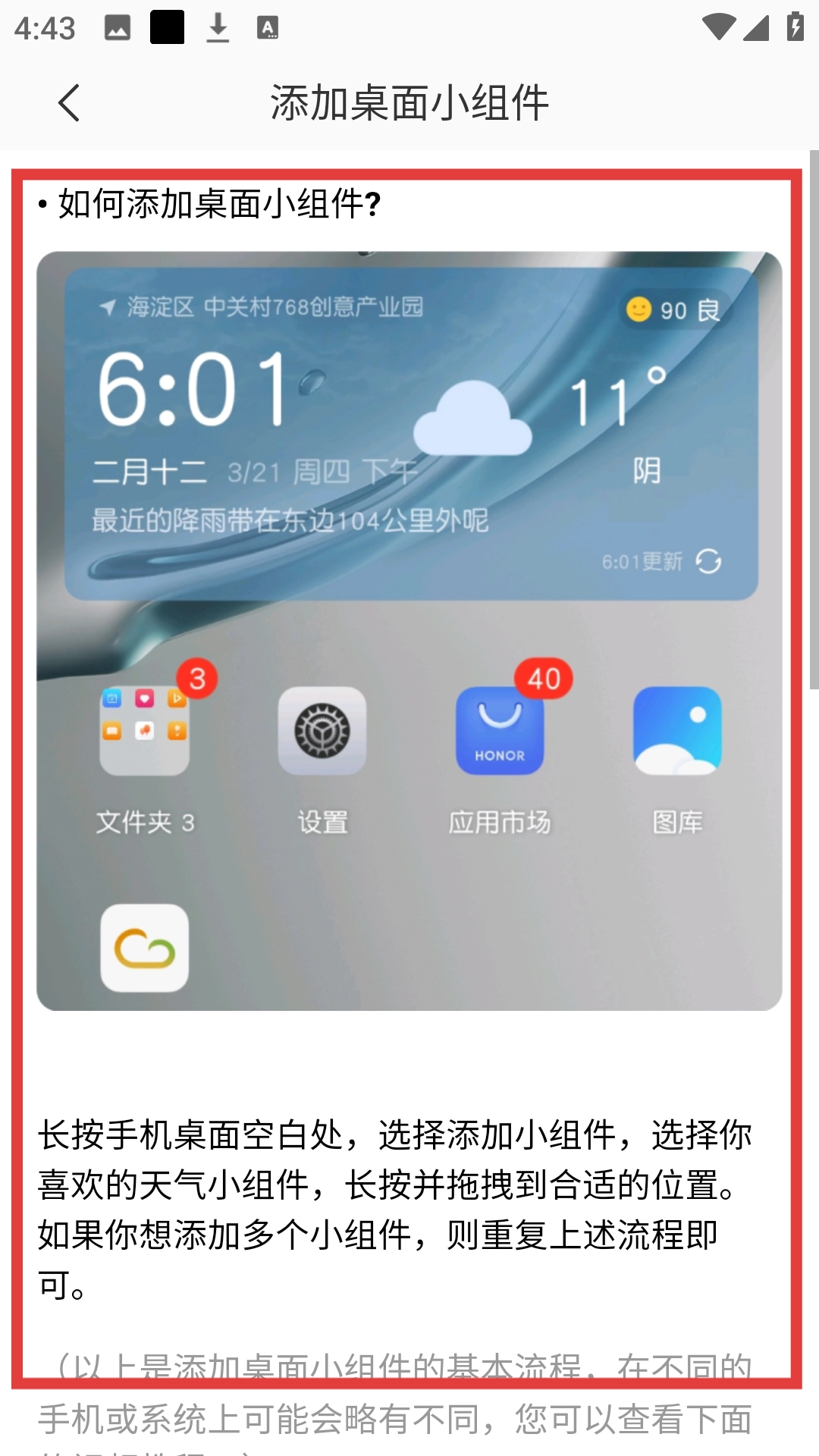 4、若想查看添加流程,可进入添加界面操作:长按手机桌面的空白区域,找到并选择“添加小组件”选项,接着将小组件拖拽至桌面合适位置,这样就完成添加啦。