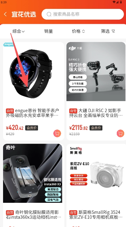 2、在商品列表页面进行浏览或筛选操作,找到目标商品(例如“恩谷智能手表”)后,点击该商品进入其详情页面。