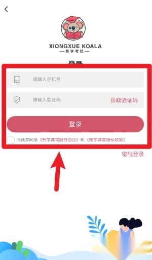 1、打开熊学课堂后,会先进入登录界面,用户需要输入手机号码并获取验证码,以此完成快速登录操作。