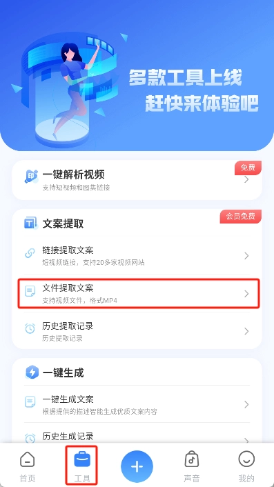 2、接着打开应用,在工具页面里点击“文件提取文案”这一选项。
