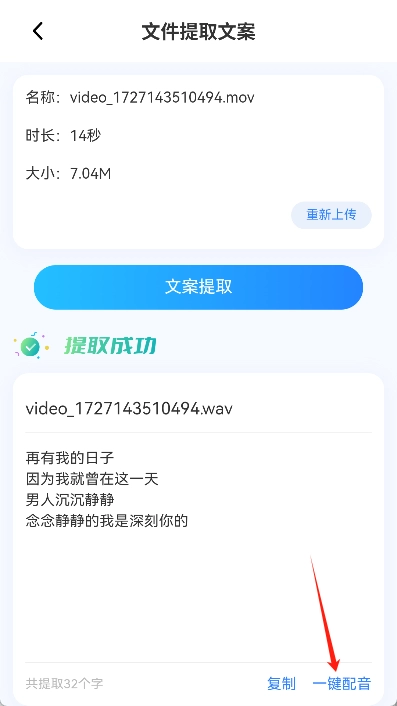 3、在文件夹中选定音频文件,待提取操作完成后,点击“一键配音”按钮。