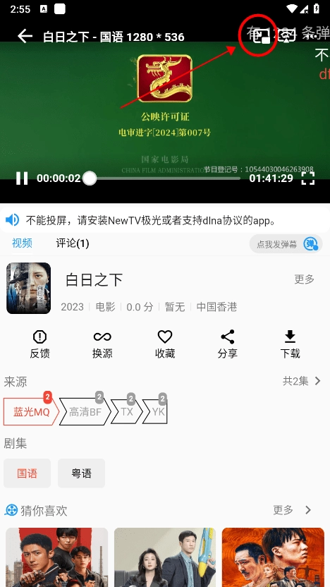 2、在播放页,点击右上角投屏图标;
