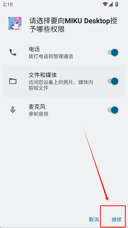 首先前往魔趣网下载并安装MIKUDesktop软件,打开软件后点击“继续”按钮,以允许MIKU Desktop获取所需的相应权限。