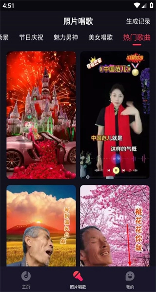 打开软件后,进入对应的页面,页面顶部设有分类标签,展示了多款唱歌效果的内容,接着点击“我的”。