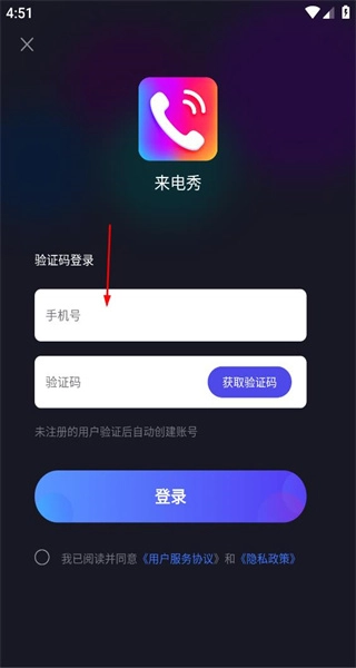 3、进入来电秀登录界面,设置手机号与验证码输入框,通过输入手机号及验证码完成登录操作。