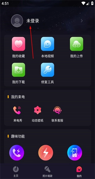 2、进入“我的”页面后,页面显示为未登录状态,设有我的收藏等功能选项,其中包含我的来电趣味功能板块,点击该未登录状态区域。