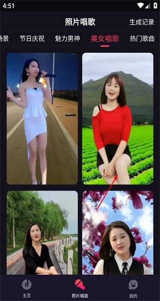4、登录后,进入“美女唱歌”标签页,该页面会展示多款对应的唱歌效果内容,其布局与“热门歌曲”板块保持一致。