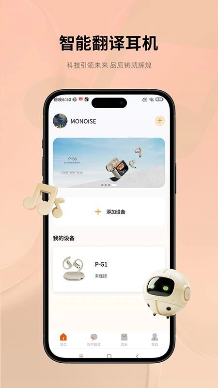 Monoise手机版是一款专门服务于智能翻译耳机设备连接与管理控制功能的应用软件。只需开启手机蓝牙模式,就能快速连接并控制智能翻译耳机设备。该软件具备多项个性化的蓝牙耳机设备控制与管理功能,可帮助用户轻松调节EQ调音模式和耳机降噪模式,打造专属的智能蓝牙耳机控制体验。此外,在Monoise免费版中,蓝牙耳机智能翻译识别工具尤为专业,能实现实时同声传译,轻松满足用户在各种场景下的翻译交流需求。喜欢这款软件的朋友可以直接下载使用。