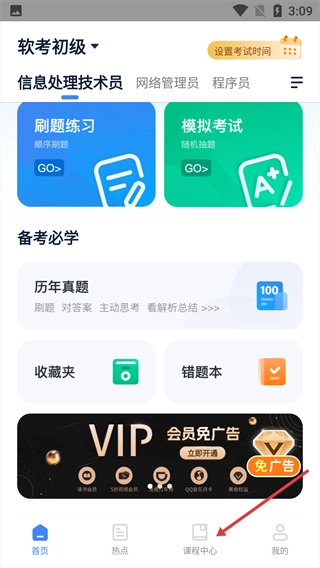 1、进入软考初级界面后,找到底部的【课程中心】按钮并点击,即可进入课程页面。