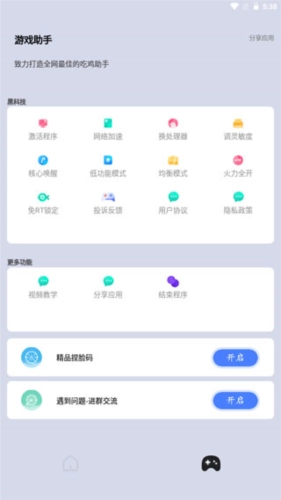 3、进入游戏助手界面后,能看到不少实用的辅助功能,像切换处理器模式、调整操作灵敏度等都包含在内。