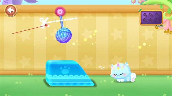 2、用剪刀把悬挂绳剪断,毛线球就会下落,小猫也会跟着变得困倦,这样就完成这一步操作了。