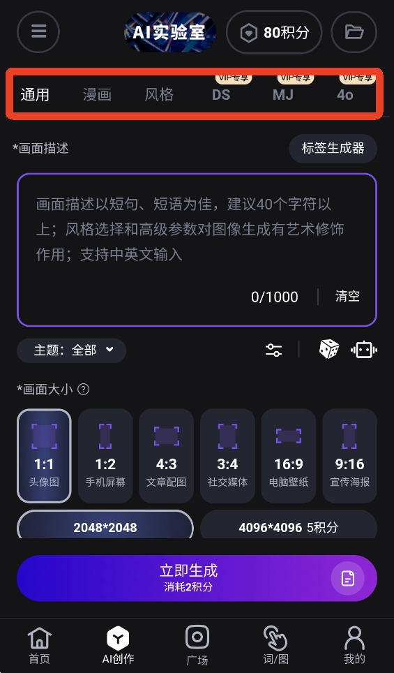 进入软件后,点击底部的【AI创作】选项,你可以挑选通用、漫画、风格等不同类型进行创作,不过生成AI图片会消耗一定积分。