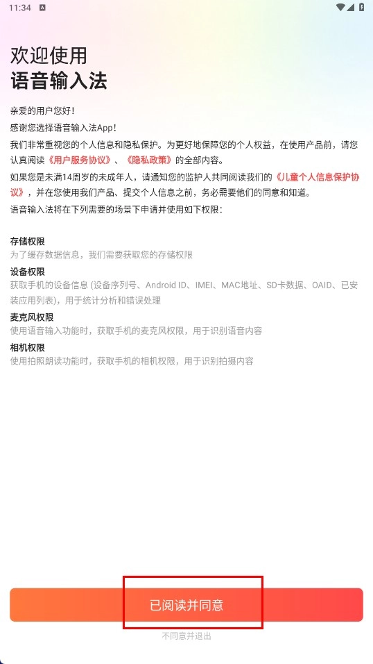 1、在欢迎页面点击【已阅读并同意】功能按钮,以确认同意用户服务协议等相关内容。