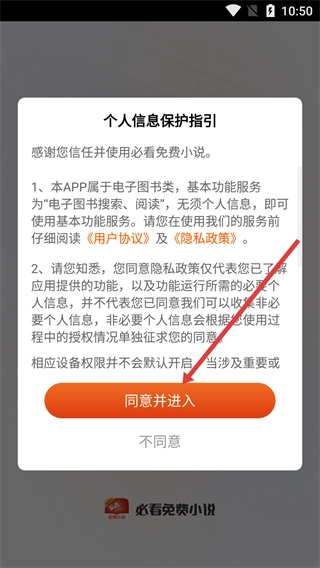 当你进入必看免费小说时,会弹出【个人信息保护指引】的弹窗,点击【同意并进入】按钮,就能进入主界面了。