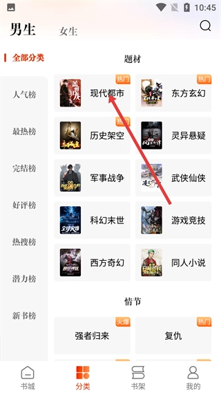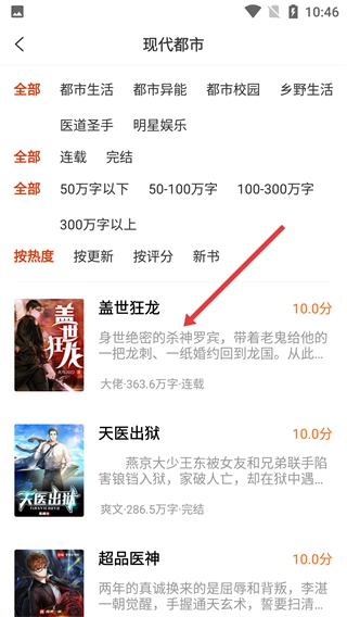 在小说分类页面,点击【现代都市】分类选项,就能进入现代都市小说列表页面。