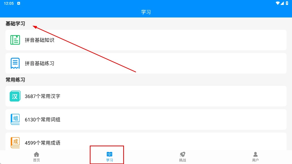 在学习页面,你可以选择【基础学习-分类板块】里的内容,比如拼音基础知识这类进行学习。