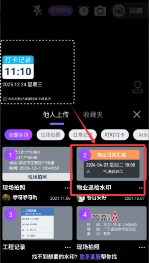 1、进行水印拍照,打开应用的水印相机,选择合适的水印模板后,即可直接拍摄带水印的照片。