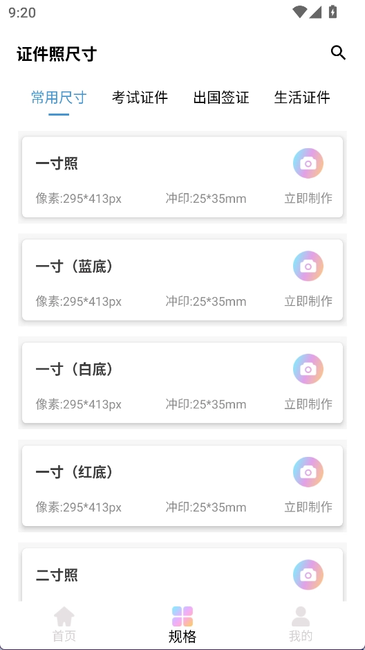 2、“规格”界面能按尺寸和用途来检索证件照规格