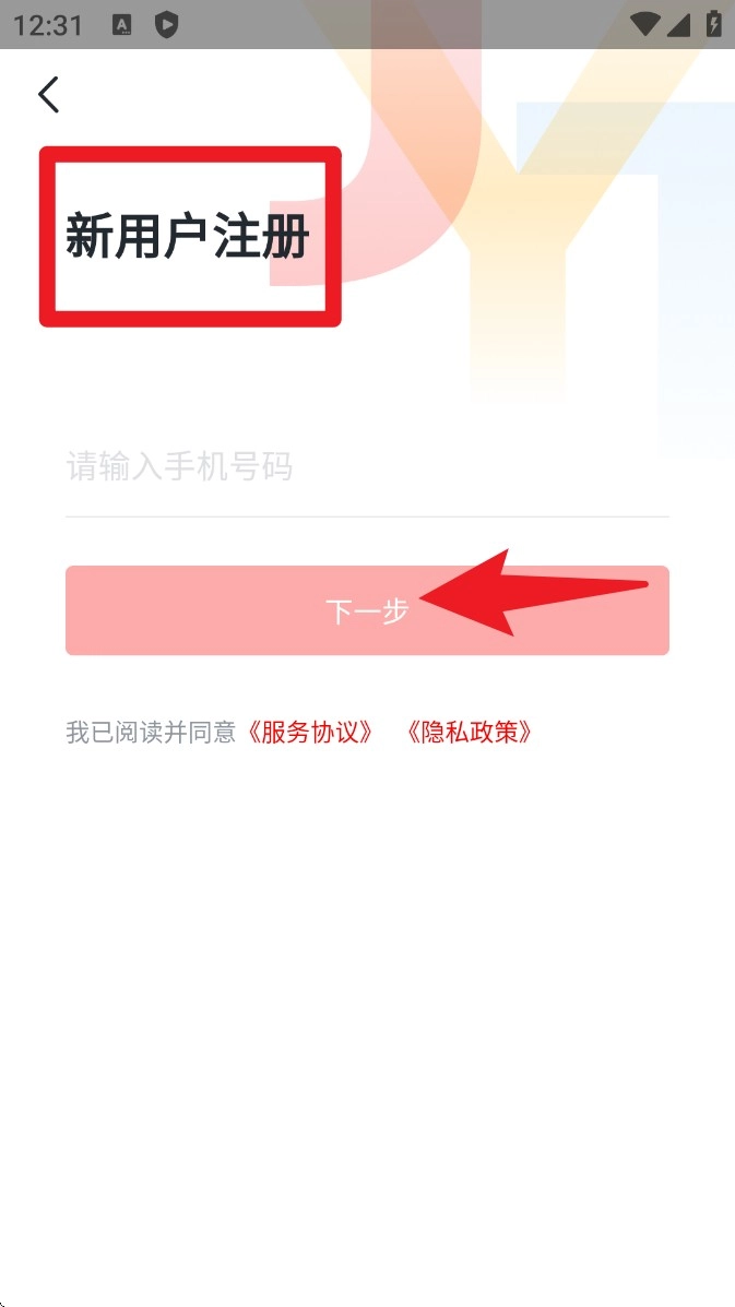 2. 在注册界面点击新用户注册,输入手机号后点击下方粉色按钮,进入验证流程继续注册。