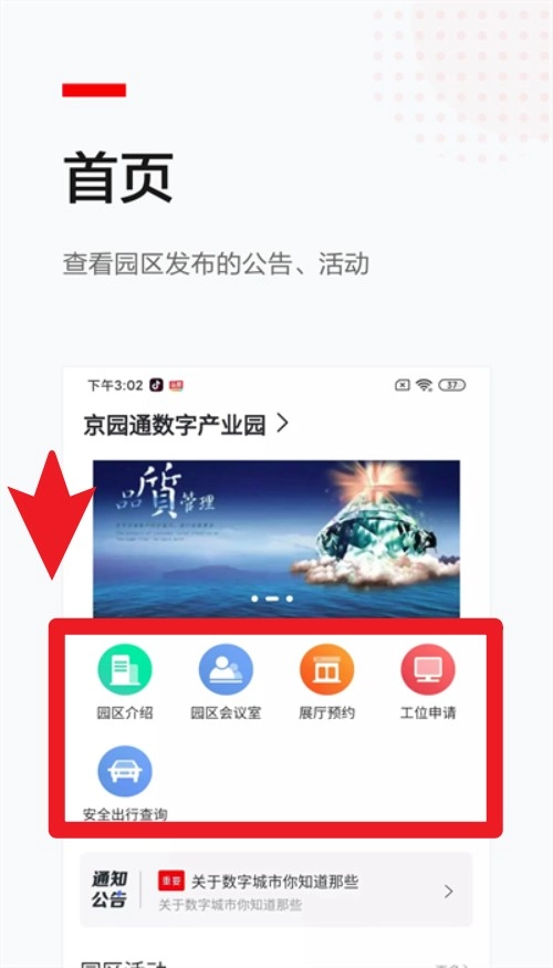3. 首页展示园区公告与活动,点击园区介绍、展厅预约等图标可快速了解园区服务内容。