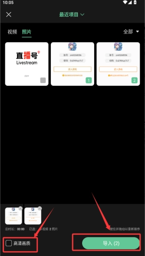 3、点击想要编辑的图片,选择左下角的高清画质选项,然后点击右侧的导入按钮就可以了。