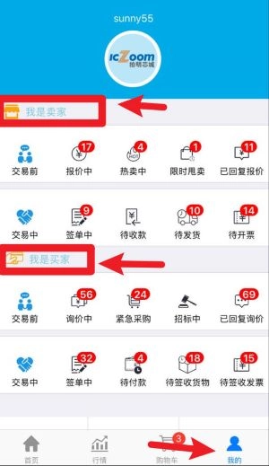 3、在我的界面中,用户可根据身份切换买家或卖家,实时掌握交易、报价、发货等流程状态。