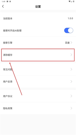 3、进入【设置】页面,找到【清除缓存】选项并点击,可进入缓存清理的选择界面。