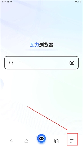 2、在【瓦力浏览器】主界面,点击底部的菜单按钮,可打开功能选项列表。