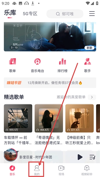 1、在乐库页面点击底部的【我的】选项,即可进入个人中心界面,之后就能管理歌单等内容了。