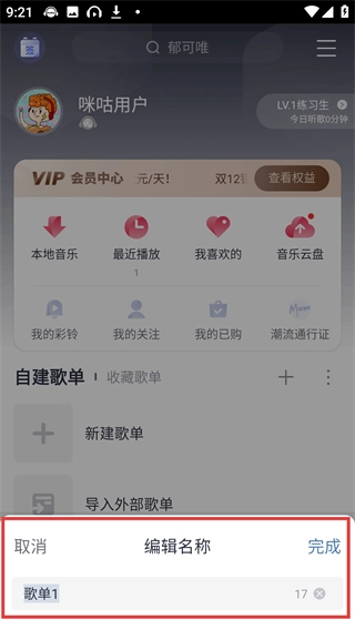 3、在歌单编辑界面输入名称,比如【歌单1】,点【完成】就能创建专属歌单啦。