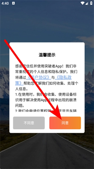 1、打开突破者,在弹出温馨提示弹窗,点击同意。