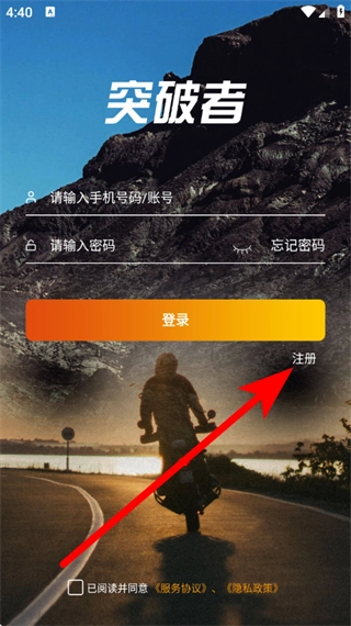 2、在突破者登录页面,点击注册选项,进入注册页面。