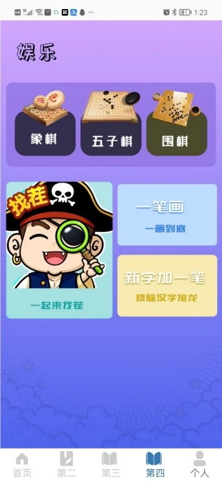 4、在第四页面中有象棋、五子棋、围棋、一起来找茬、一笔画、新字加一笔等功能。