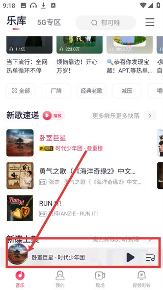 1、在乐库页面点击底部播放栏里的歌曲,就能进入该歌曲的播放详情页面,开启沉浸式听歌啦。