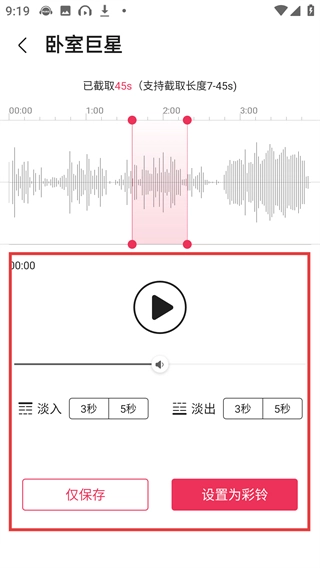 4、在彩铃DIY页面调整截取的歌曲片段,还能设置淡入淡出效果,最后点击对应按钮就能保存或设为彩铃啦。