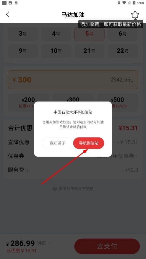 4、点击【导航到油站】功能按钮,前往加油站,和加油员确认好金额后进行付款。
