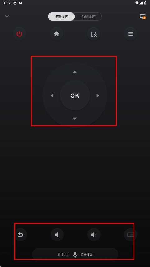 4、进入投屏控制页面后,能够运用【按键遥控】区域的功能键,以及音量调节、语音搜索等功能。