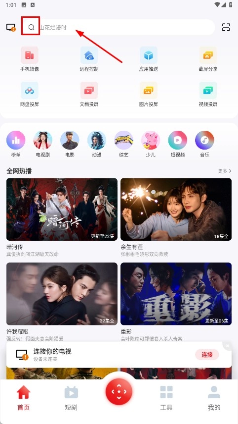 1、点击搜索栏旁边的【搜索功能按钮】,输入关键词来搜索影视内容。