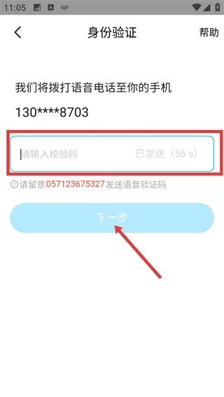 4、进入身份验证页面后,先输入语音校验码,再点击【下一步】按钮,即可完成身份验证的全部流程。