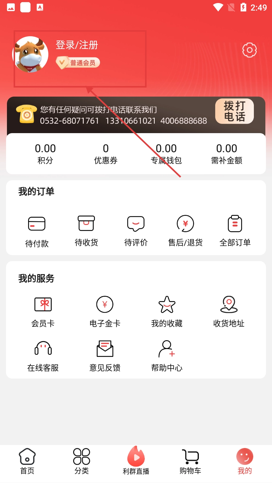 2、在【我的】页面中,点击【登录/注册】区域就能进入登录流程,这样就可以使用订单管理、会员服务等功能了。
