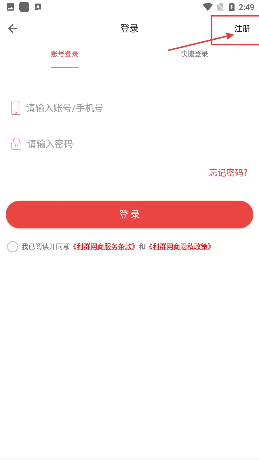 3、在登录页面,要是还没有注册账号,点击【注册】按钮就能进入注册流程。