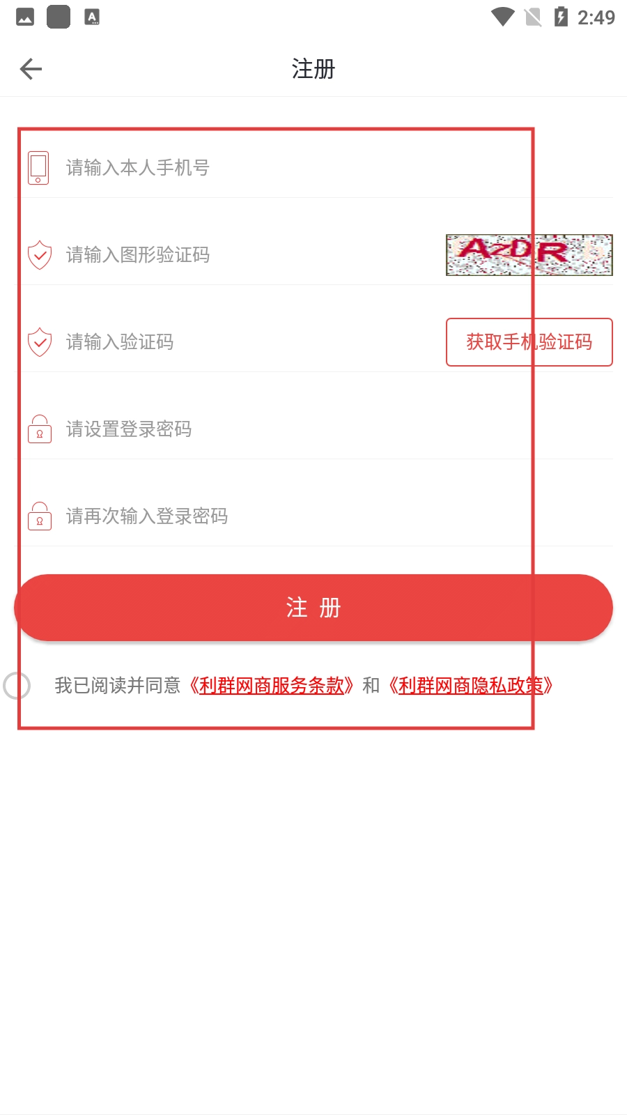 4、进入注册页面后,依次输入本人的手机号码,填写页面显示的图形验证码,点击获取手机验证码并填写收到的验证码,接着设置登录密码并再次输入密码进行确认。