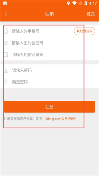 4、进入注册界面后,按顺序填写【手机号】、图片验证码、短信验证码,接着设置并确认密码,最后点击【注册】按钮即可完成注册流程。