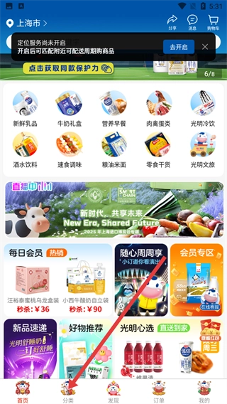 2、在分类页面的【光明乳品】分类下,选择【新鲜牛奶】选项,即可进入新鲜牛奶的商品列表页面。