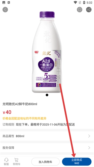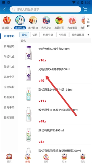 3、在新鲜牛奶的商品列表里,找到像【光明致优A2鲜牛奶800ml】这样的目标商品,点击该商品的条目,就能进入商品详情页面。